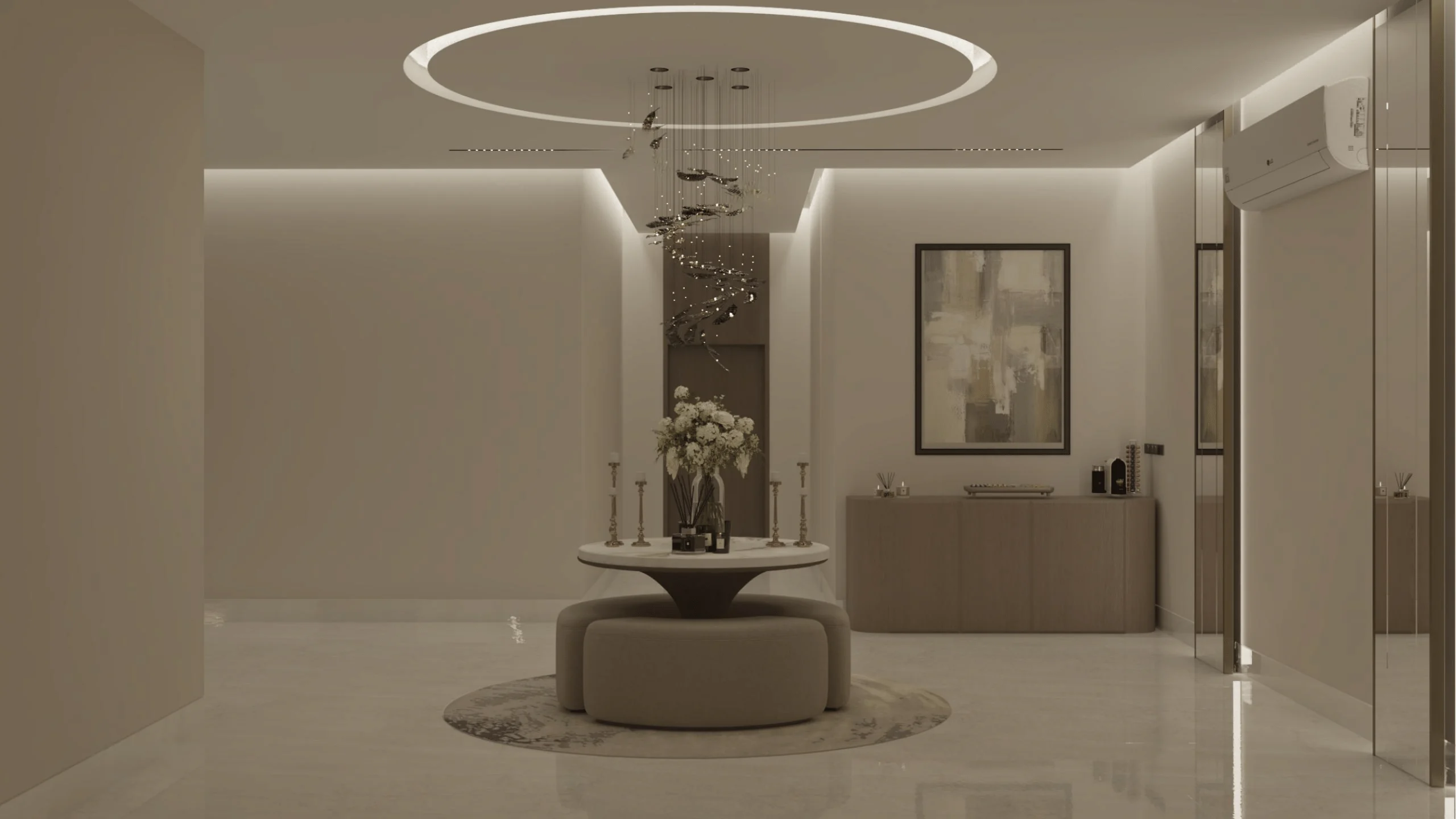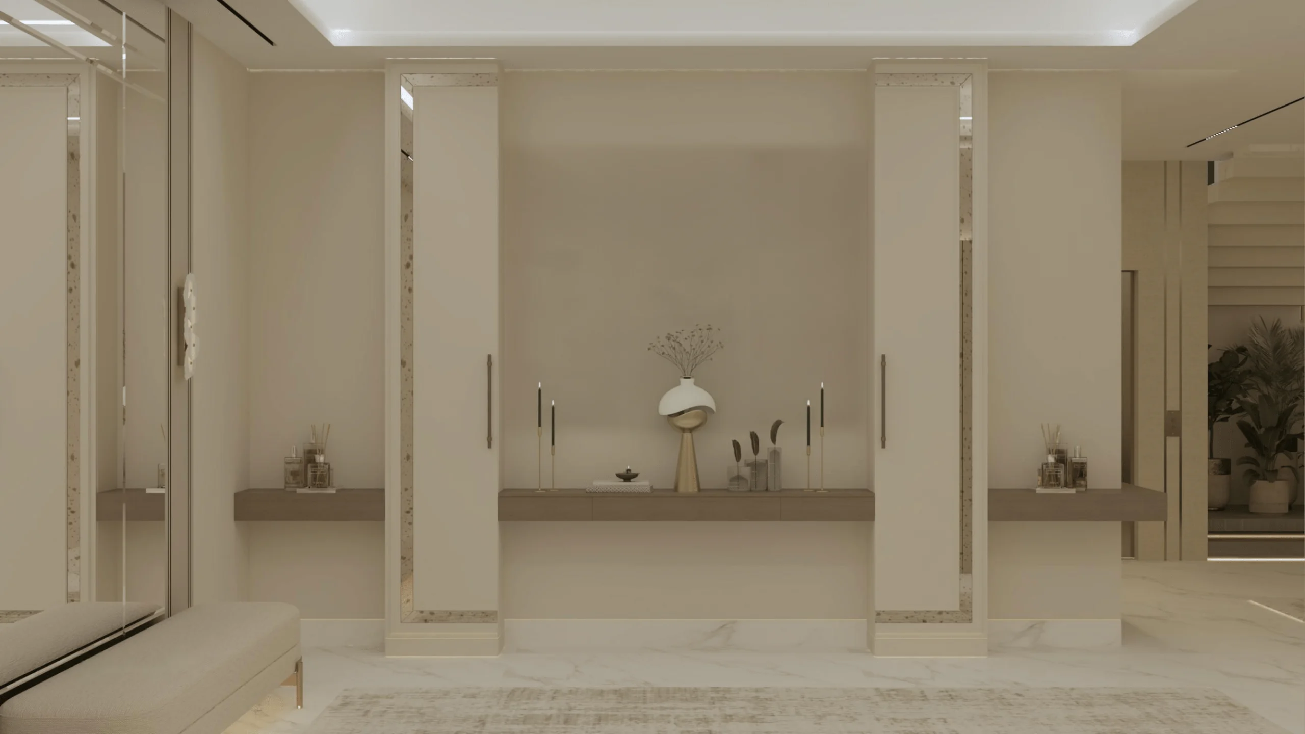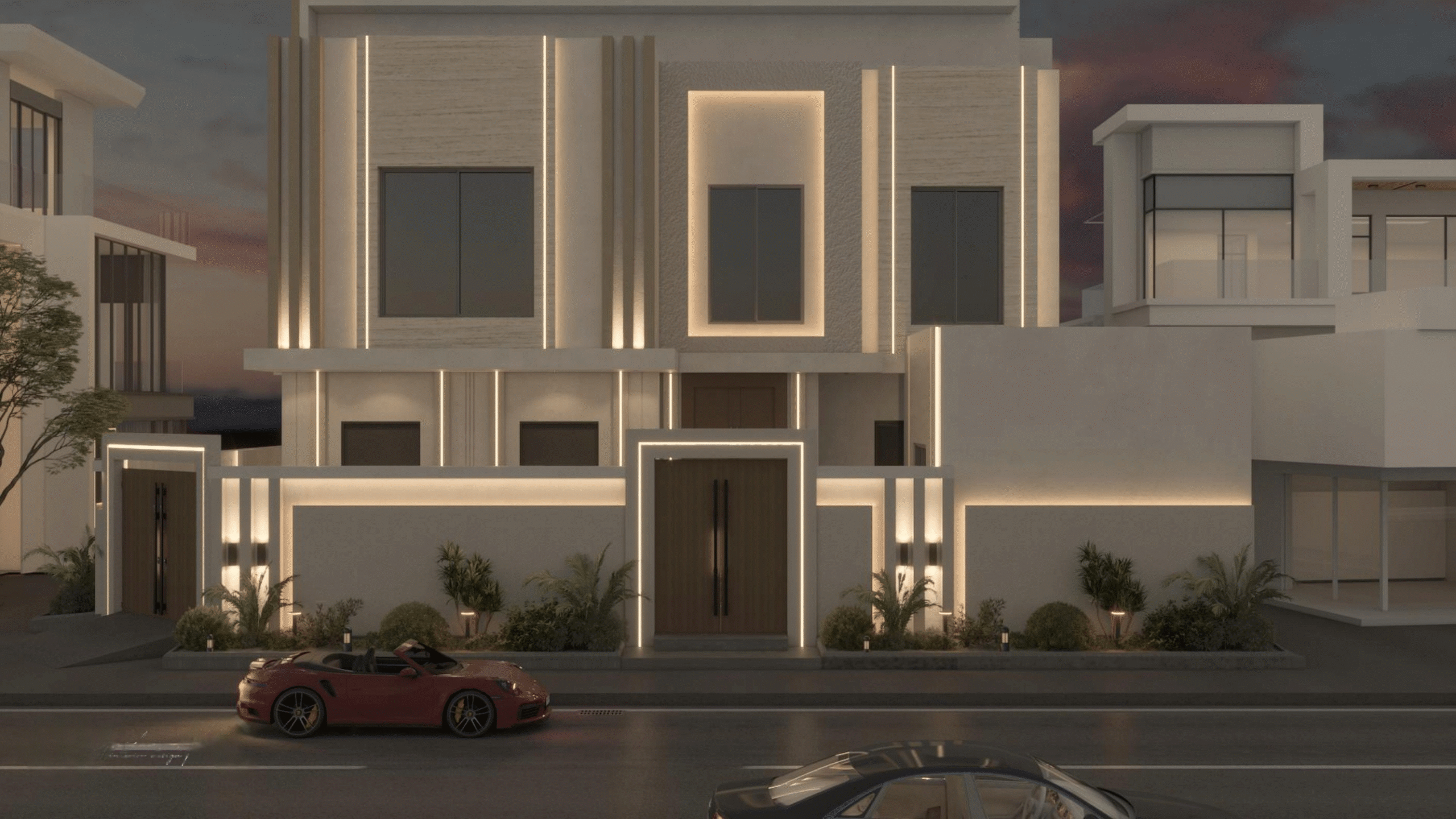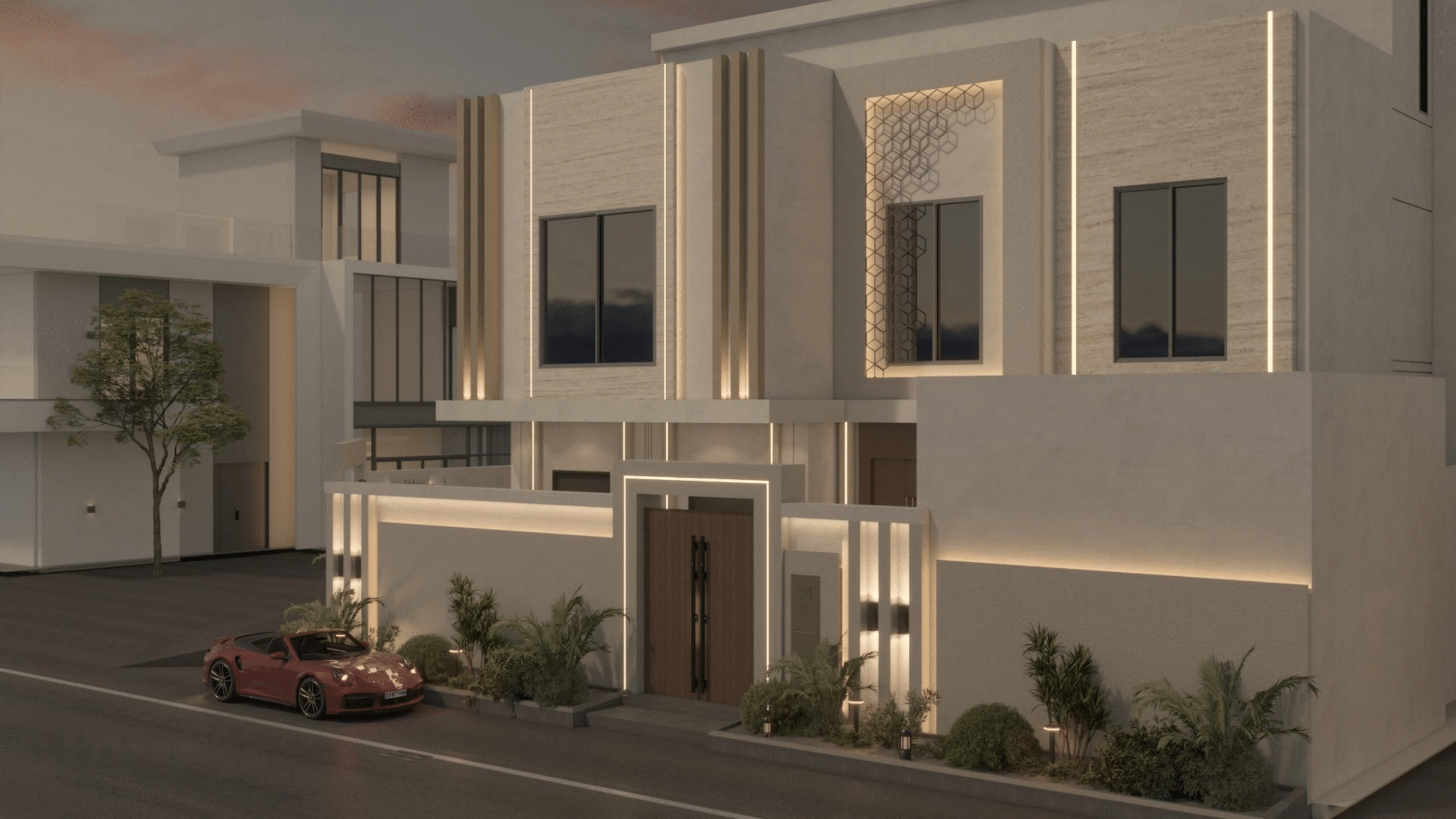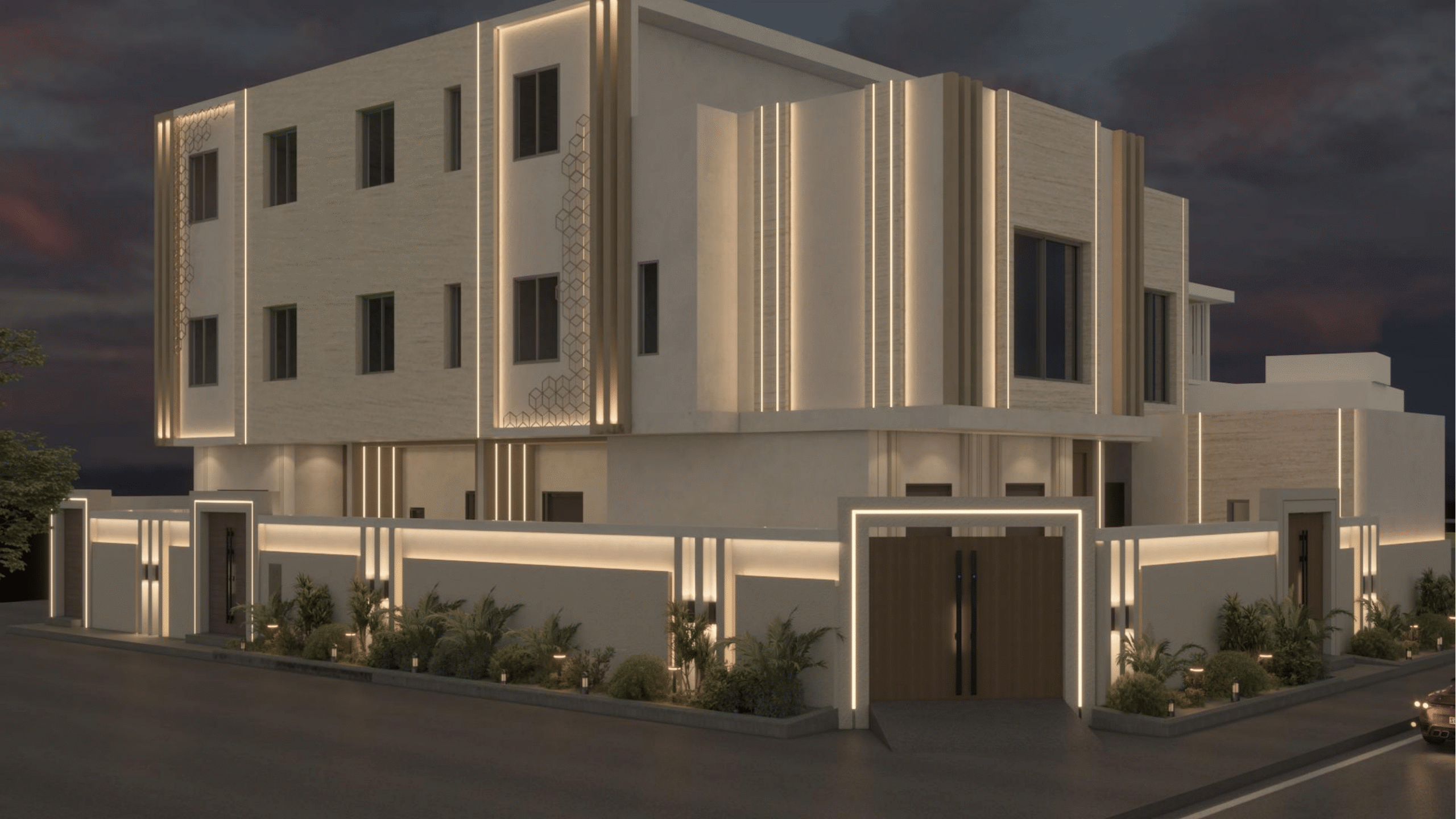 يحتوي على شقتين من الواجهة الجانبية بمدخل ممتاز ويشمل المشروع أعمال التشطيب الداخلي والخارجي وتأسيس السباكة والكهرباء والتمديدات الخاصة بالتكييف (النحاس، الدكت) وتركيب الأرضيات والدهانات والأبواب والنوافذ والديكورات الداخلية