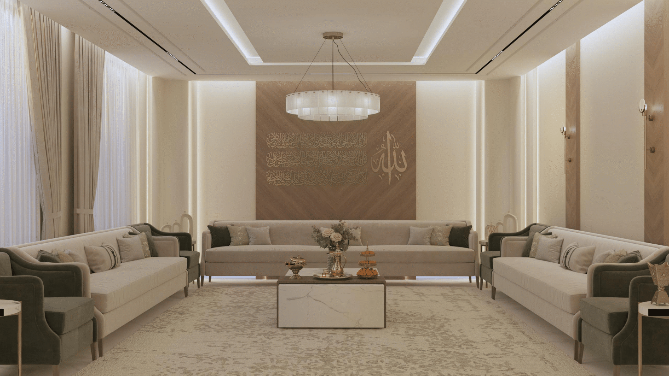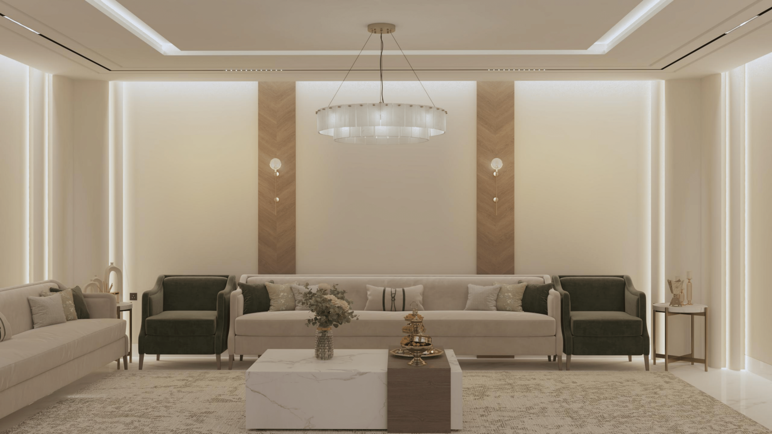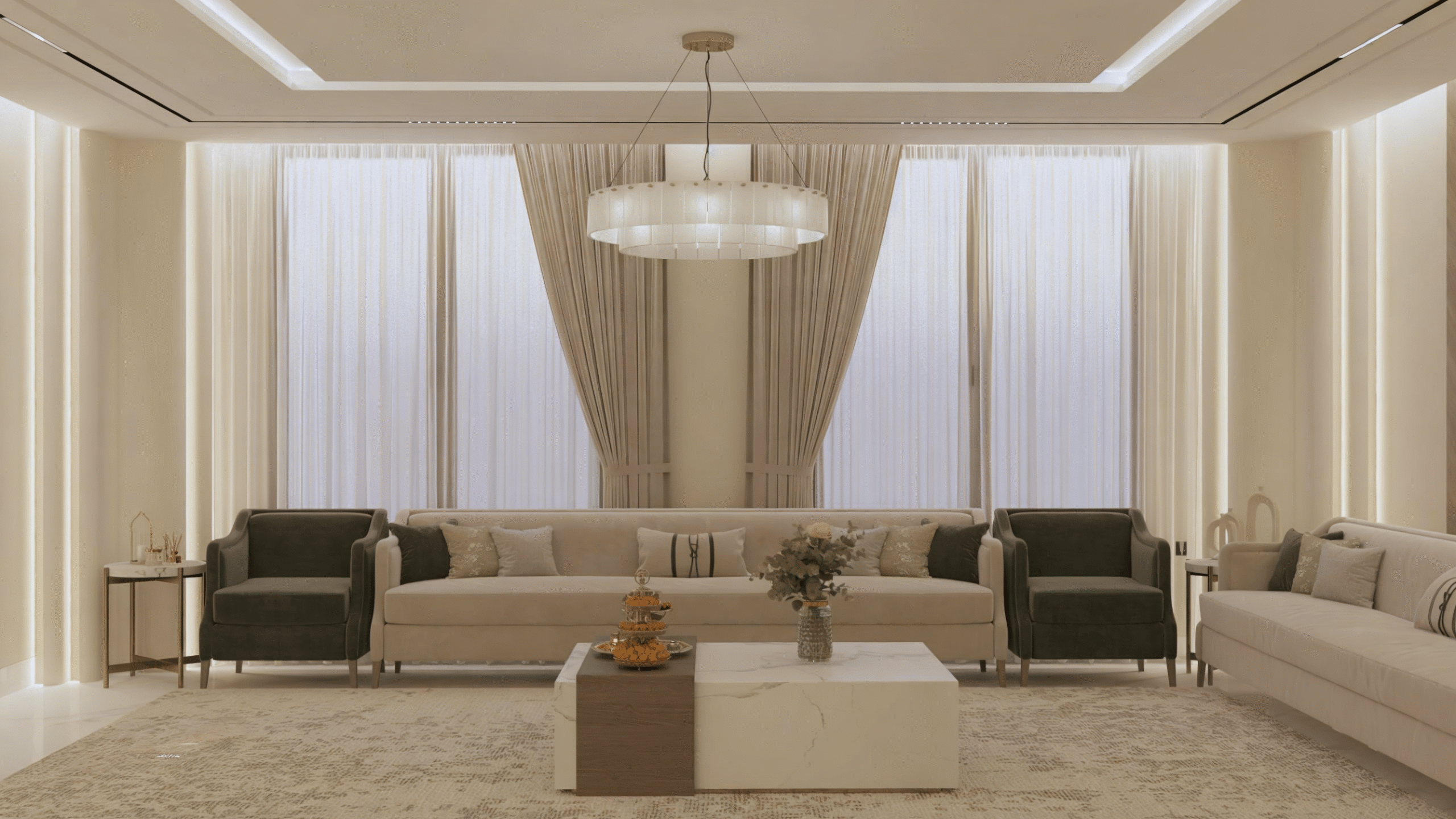 يتم استخدام مواد عالية الجودة ومتينة مثل البورسلين للأرضيات والدهانات الأكريليكية للجدران تصميم وتركيب مجاري الهواء (الدكتات) والأخشاب الصلبة للأبواب والألمونيوم للنوافذ