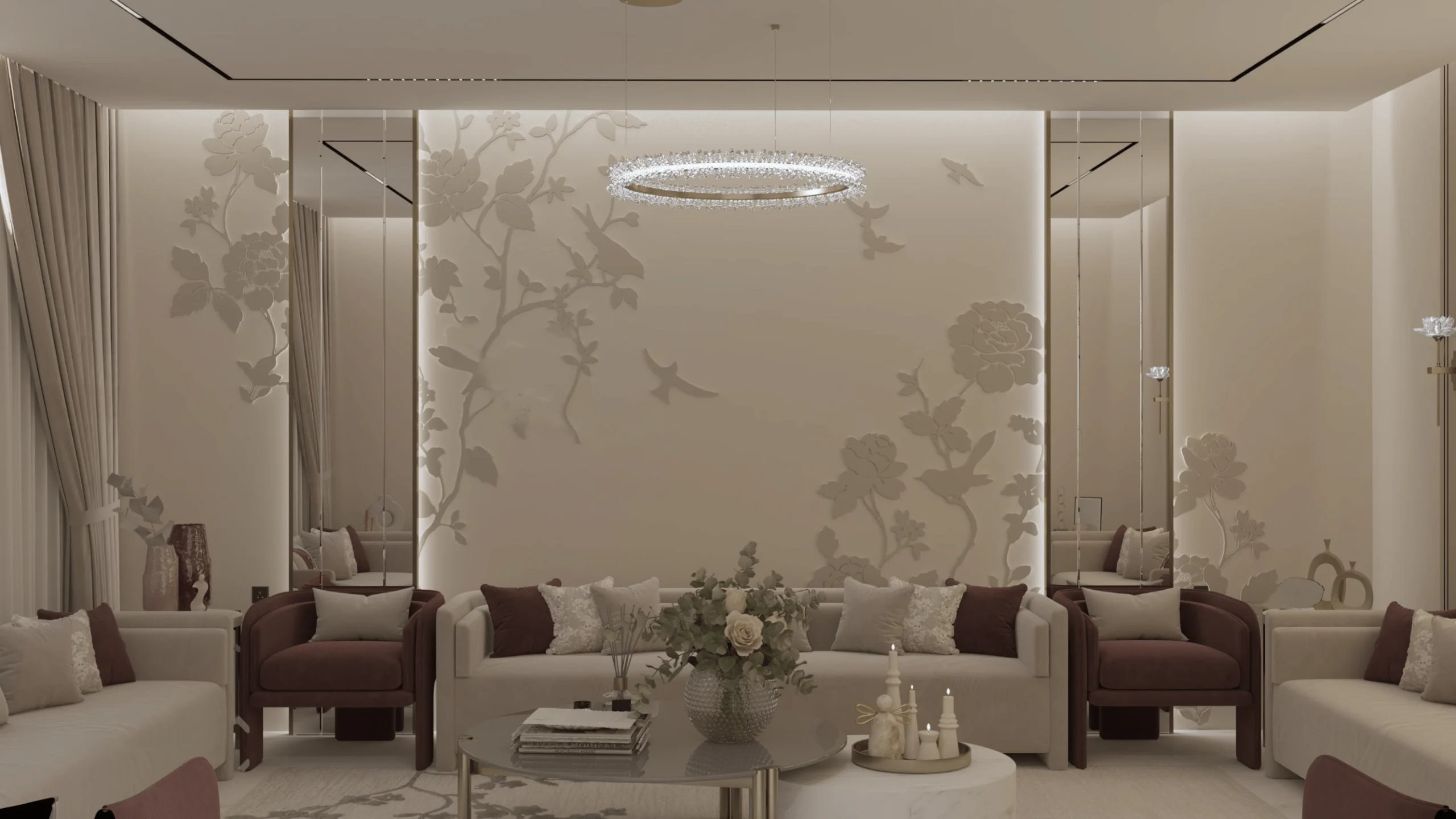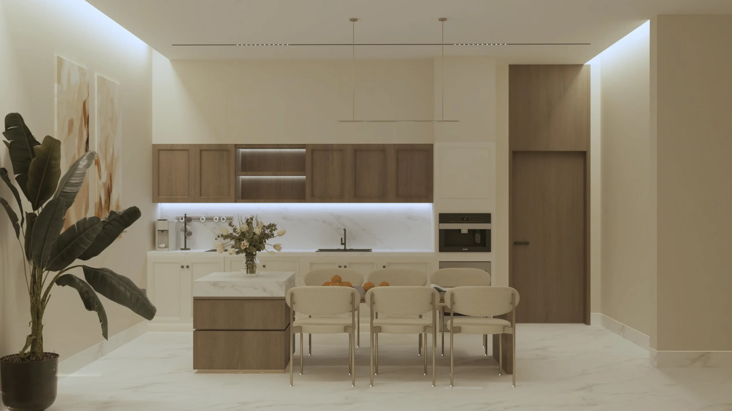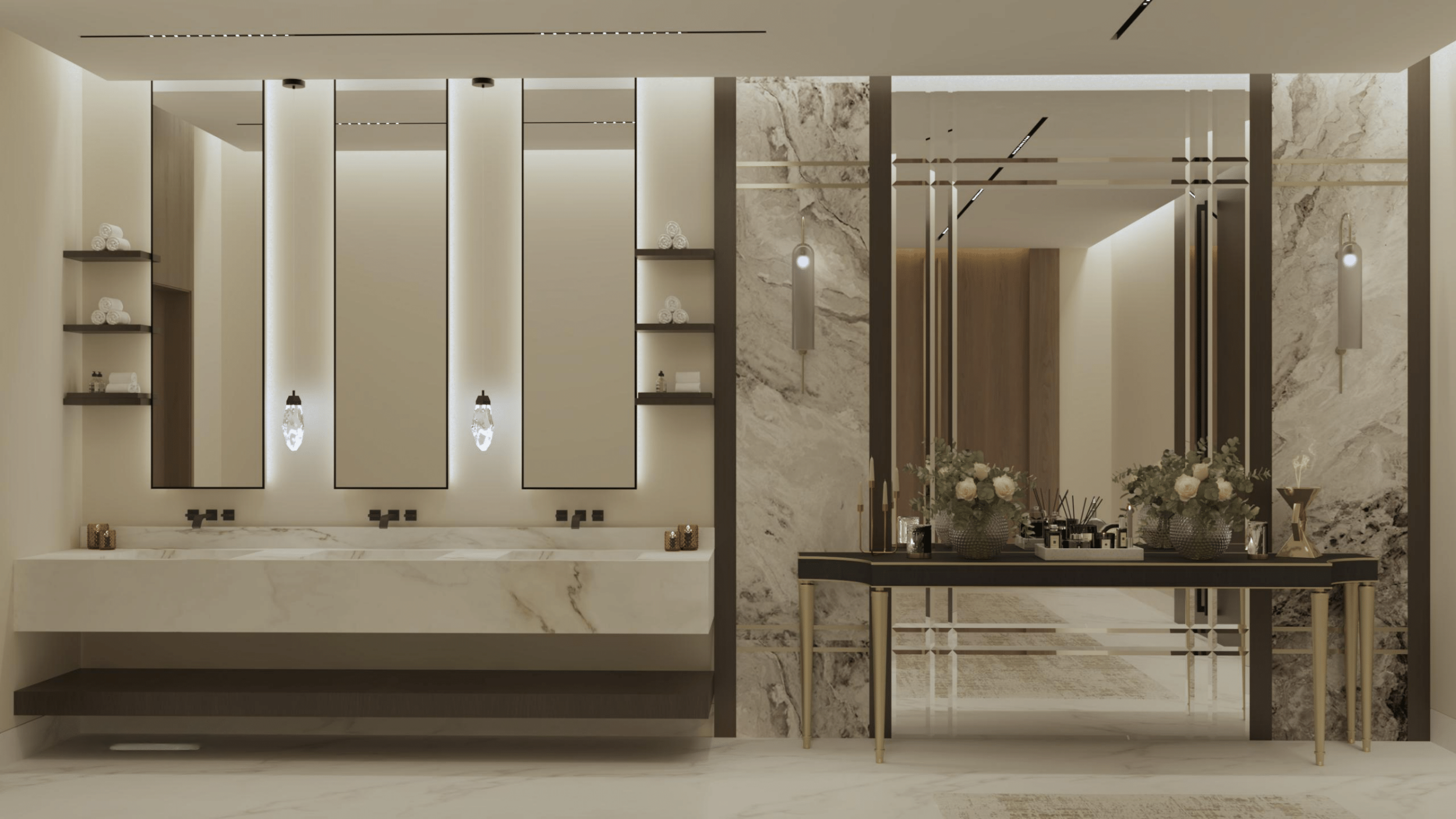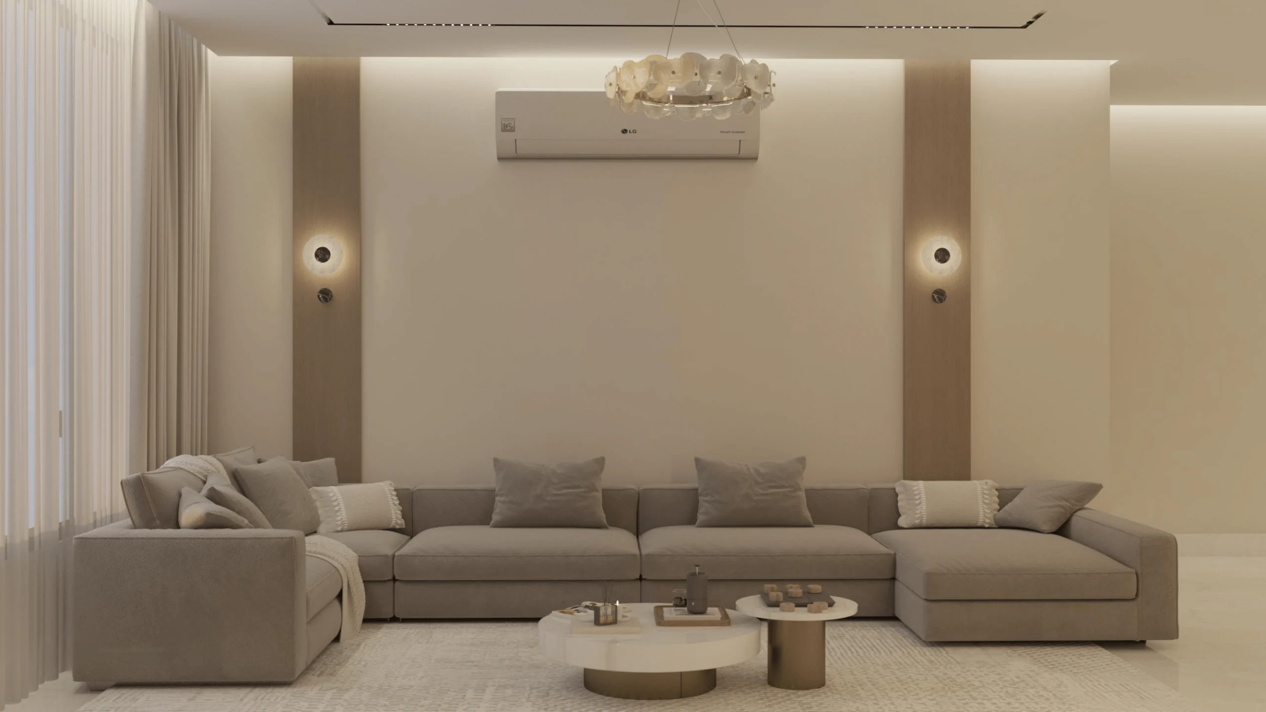 يتم استخدام مواد عالية الجودة ومتينة مثل البورسلين للأرضيات والدهانات الأكريليكية للجدران تصميم وتركيب مجاري الهواء (الدكتات) والأخشاب الصلبة للأبواب والألمونيوم للنوافذ